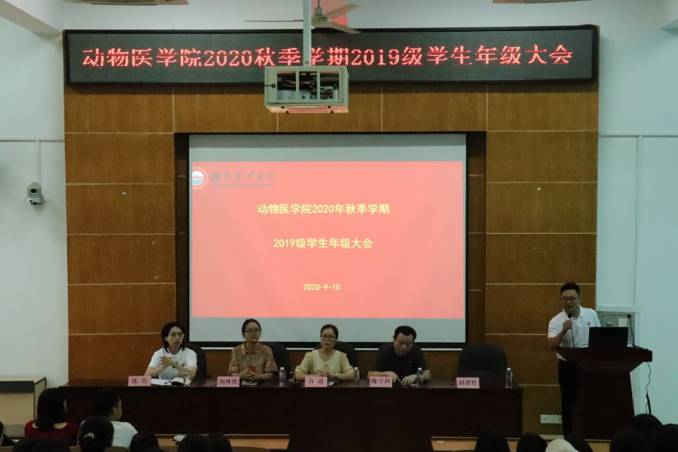 为加强复学后学生思想政治教育,同时强化学风建设和提升防控认知,9月10日中午,动物医学院2020年秋季学期2019级年级大会于动医楼T型教室举行。动物医学院党委副书记兼副院长首道老师,学工组陈宇科老师,刘林艳老师,辅导员陈伶老师,赵建松老师出席会议,19级全体同学参加。本次会议由赵建松老师主持。