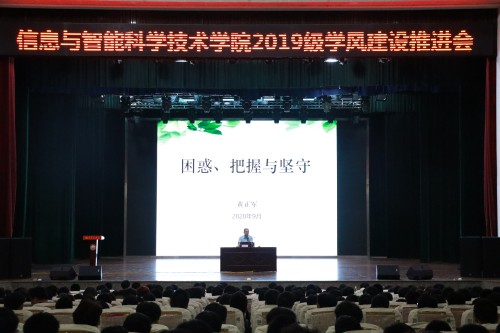 9月24日晚,信息与智能科学技术学院2019级学风建设推进会在大礼堂顺利举行。出席本次会议的嘉宾有信科学院党委副书记兼副院长黄正军老师,辅导员李威、戴理波老师。学院2019级全体学生参加会议,会议由李威老师主持。