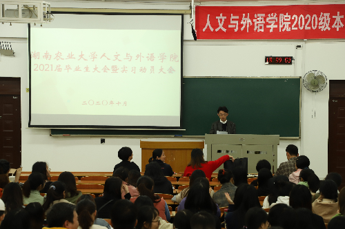 为进一步加强毕业生对于当前就业形势的认识,增强就业观念,提升就业能力,人文与外语学院于2020年10月19日晚召开2021届毕业生大会暨实习动员大会。本次会议由学工组彭阳老师主持,院党委副书记唐琳教授,范丽群老师,周丽老师,王丽珠老师和姜启凡老师出席会议,2021届全体毕业生到会。
