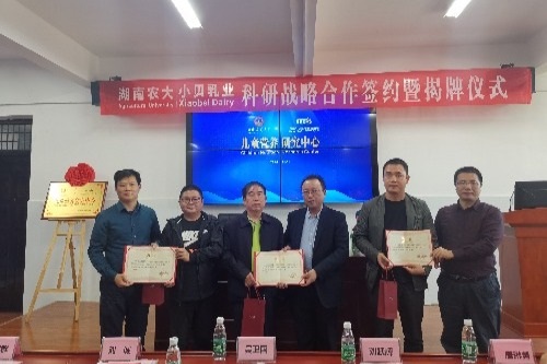 吴卫国和刘诚代表双方签署科研战略合作协议,为儿童营养研究中心揭牌,标志着湖南农业大学食品科学技术学院与小贝乳业的科研战略合作正式展开。