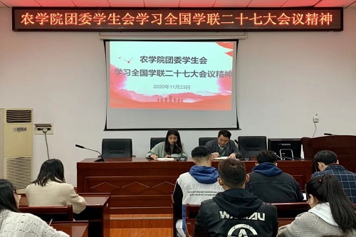 11月23日中午,农学院团委、学生会主席团成员及部门负责人在一教401对全国学联二十七大会议精神进行集中学习。辅导员李铁玉、郭琳参加了本次活动。张敏燕主持学习。