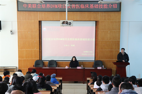 为让同学们更加了解国内外动物医学专业形势,明确学习目标,12月22日中午,“中美联合培养DVM项目及兽医临床基础技能介绍”讲座于动医楼T型教室举行。PetcareAbc创始人陈璐,动物医学院院长郑晓峰出席讲座,动物医学院2020级全体本科生参加讲座。讲座由陈璐主讲,郑晓峰院长主持。