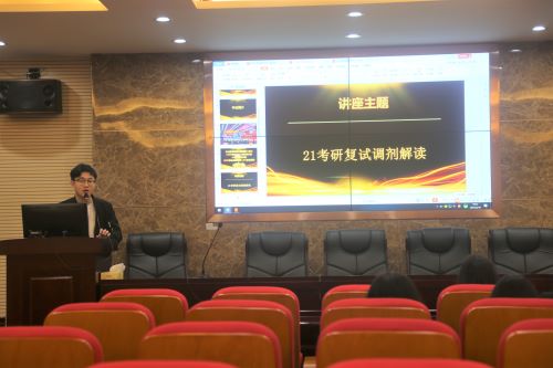 讲座开始,讲座主持人黄生辉简单介绍了此次讲座的内容,随后中公教育康雄老师讲解。本次讲座的主题为“2021年考研复试调剂”,康雄老师将内容分为三个部分进行讲解,包括考研复试备考指导、考试小技巧与学生答疑。首先,康雄老师介绍了考研复试的简单流程,给大家一个初步的印象,说明了考研复试的内容,在老师流畅的讲解与清晰的解读下,在场学生不时拿着本子和笔记着笔记。讲座第二部分是复试面试小技巧,康雄老师将历年考研复试面试大数据进行对比分析,以中国农业大学,广西大学为例展开说明,加深了同学们对面试形式与面试流程的认知。他强调,面试对于考研学生十分重要,机遇是留给有准备的人,同学们一定要在面试前进行必要的咨询,检查和培训,并对当今社会发展与时代背景有一定的了解。讲座最后来到答疑环节,康雄老师耐心地等待同学们的问答并留下了联系方式以为方便同学们答疑。