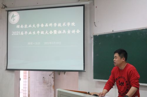 为推进毕业生就业工作顺利开展,确保毕业生文明离校,5月19日上午,食科院在七教T1教室顺利召开2021届毕业生大会。本次会议由食科学院就业专干刘洋老师主持,湖南农业大学校党委武装部谭煌辉、湖南万众和社区服务职业技能培训学校校长石沁敏、食科学院党委副书记林曙出席会议。2021届全体毕业生与会。