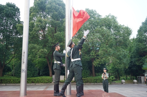 6时25分,全体师生列队站好,升旗仪式正式开始。国旗护卫队高唱《歌唱祖国》,踏着整齐划一、铿锵有力的步伐入场。伴随高昂雄壮的国歌,五星红旗冉冉升起,在场师生肃立、行注目礼,共同感受这庄严的时刻。国旗和校旗在高空中迎风飘扬,这一幕激发了同学们不断向上的斗志,点燃了同学们强烈的爱国、爱校热情。