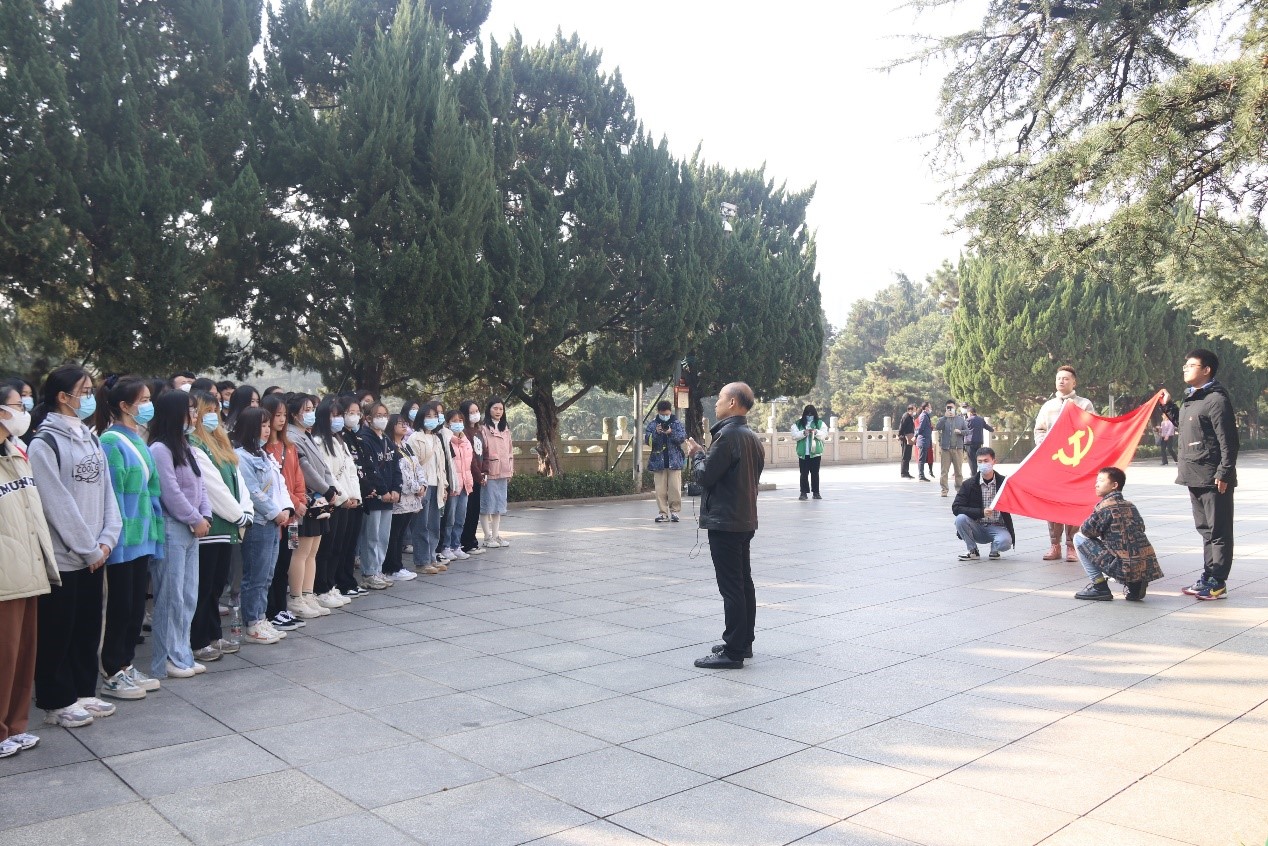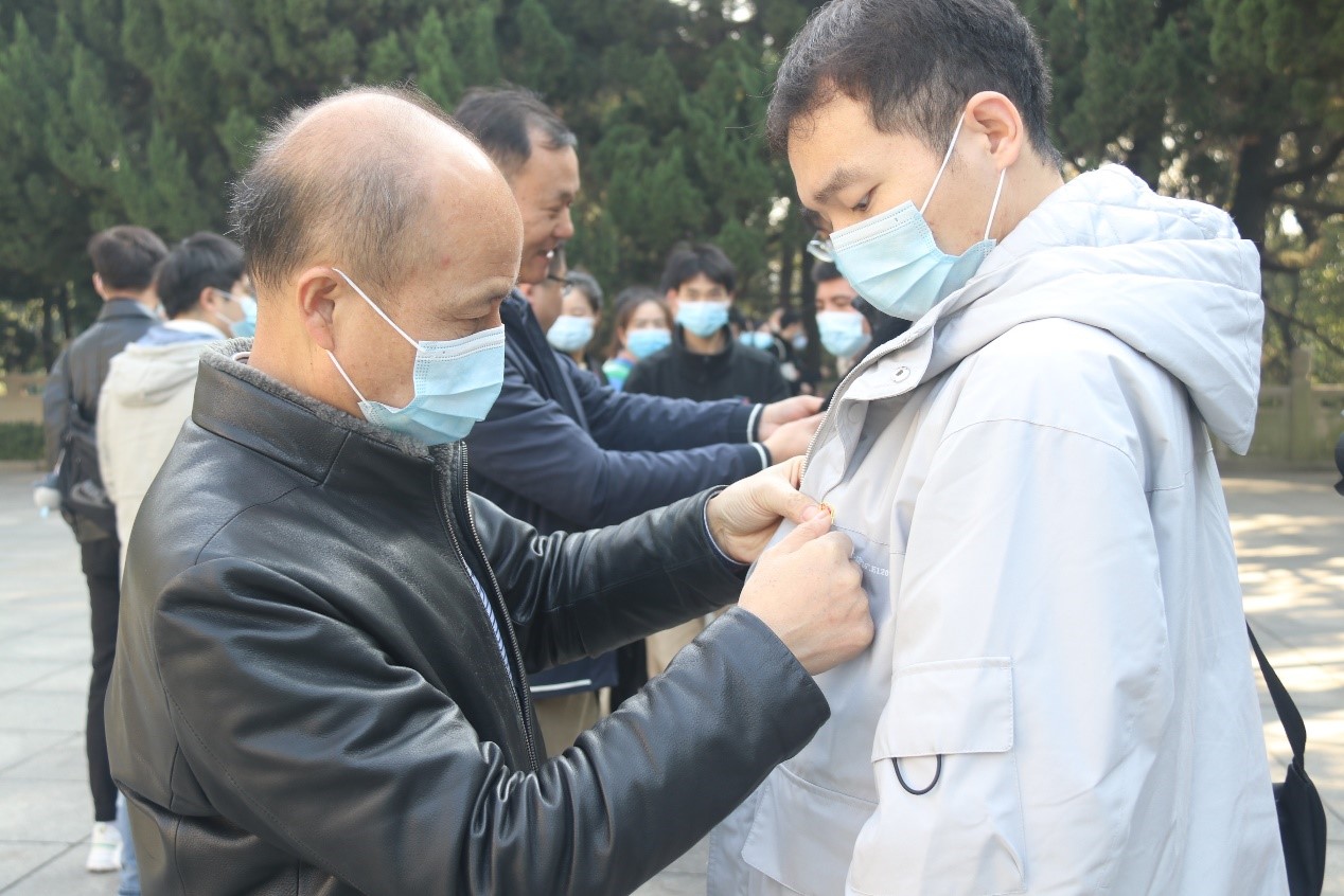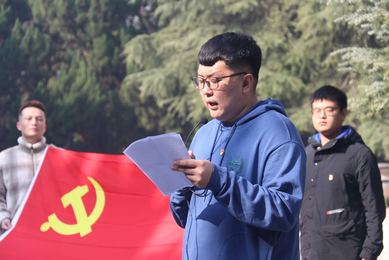 烈士塔前,老党员为新发展党员佩戴党员徽章,告诫新党员要牢记党员身份,永葆政治本色,积极发挥作用。本科生第二党支部书记张璐老师带领新党员进行入党宣誓,老党员一同重温入党誓词;誓言掷地有声,表达出当代共产党人传承光荣传统、承载光荣使命的决心和斗志。新党员代表张宇龙发言,表示“要继承和发扬革命先烈的光荣传统和革命精神,立大志、明大德、成大才、担大任,积极投身于乡村振兴与农业现代化的伟大事业中”与全体党员共勉。