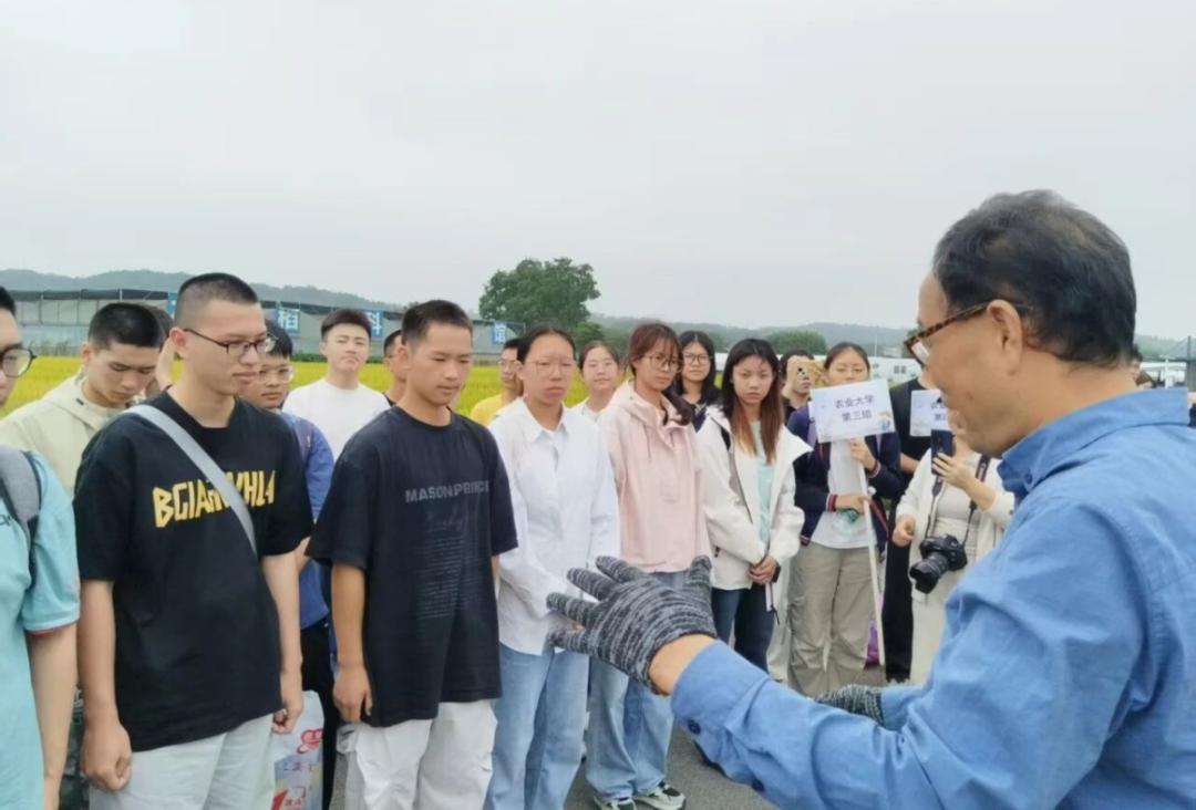 活动伊始,同学们认真听取黄璜教授讲授割稻的技巧与注意事项。