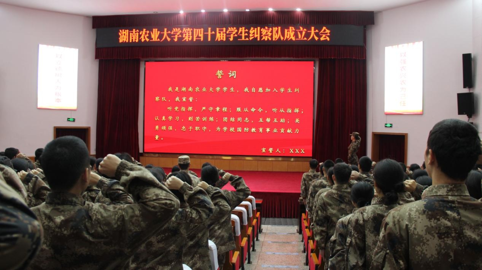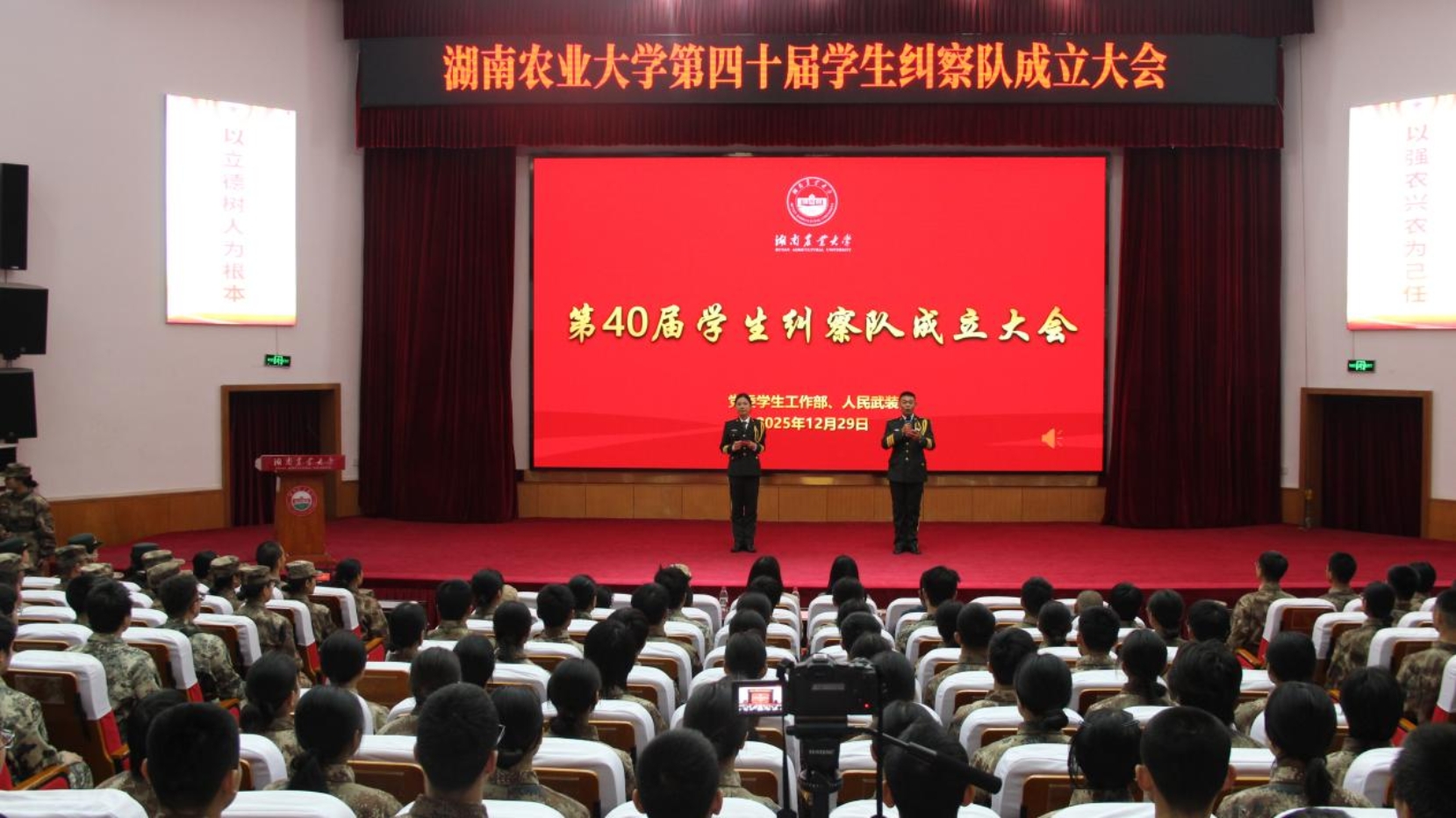 2025年12月29日,湖南农业大学第40届学生纠察队成立大会在修业讲堂隆重召开。学生工作部、武装部部长李姣,副部长夏棣稀,学生工作部副部长朱佳,各科室(教研室)负责人,学生纠察队第39届、第40届学生纠察队全体成员参加大会。