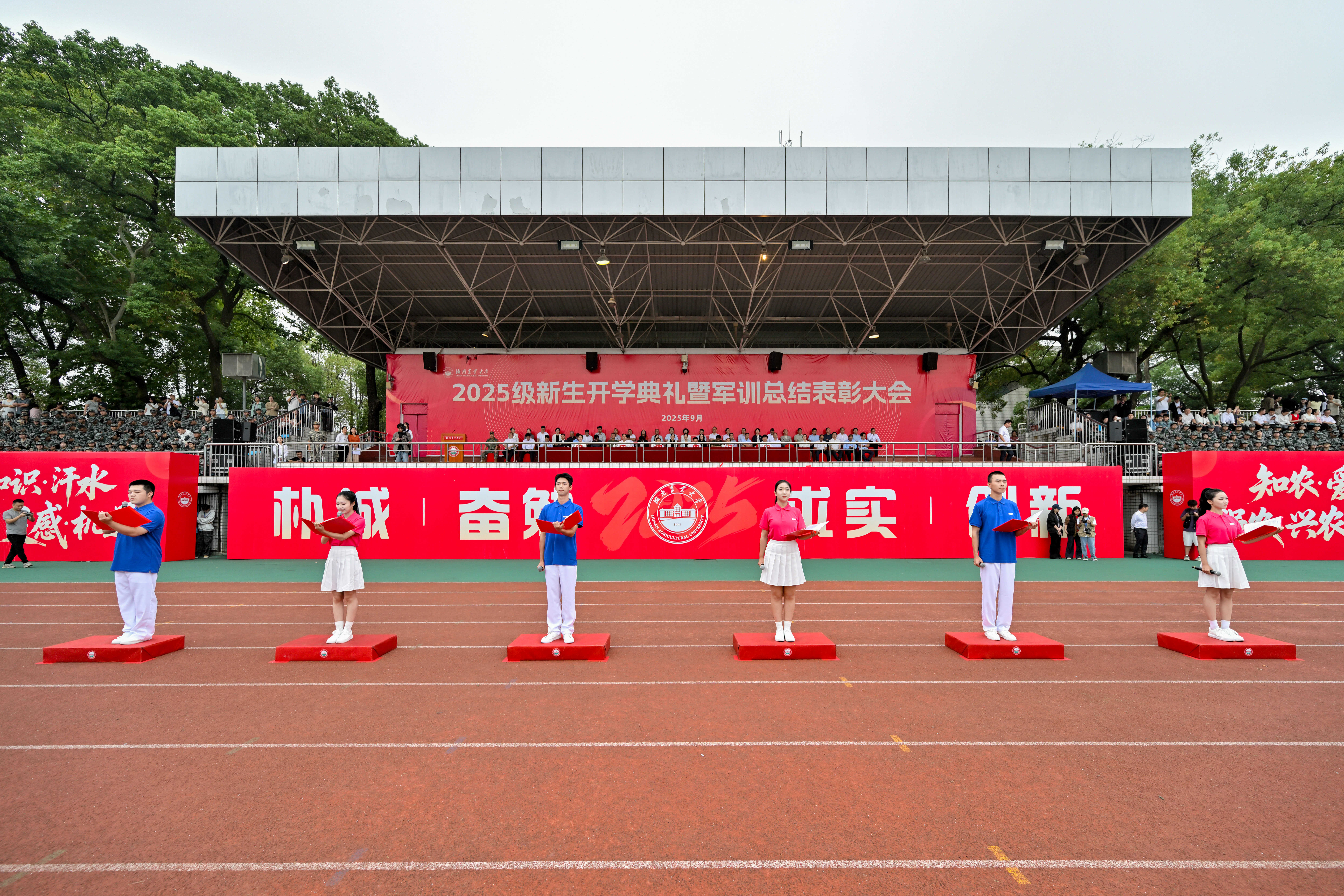 本网讯(学生工作部 朱逸飞)9月30日,2025级新生开学典礼暨军训总结表彰大会在学校东田径场举行。校党委副书记、校长、中国工程院院士邹学校,全体在校领导,各职能部门及学院相关负责人出席,2025级全体本科生、研究生及留学生参加典礼。校党委委员、副校长吴波宣读军训表彰决定,与会校领导为获奖单位和个人颁奖;校党委委员、副校长覃红燕主持典礼。