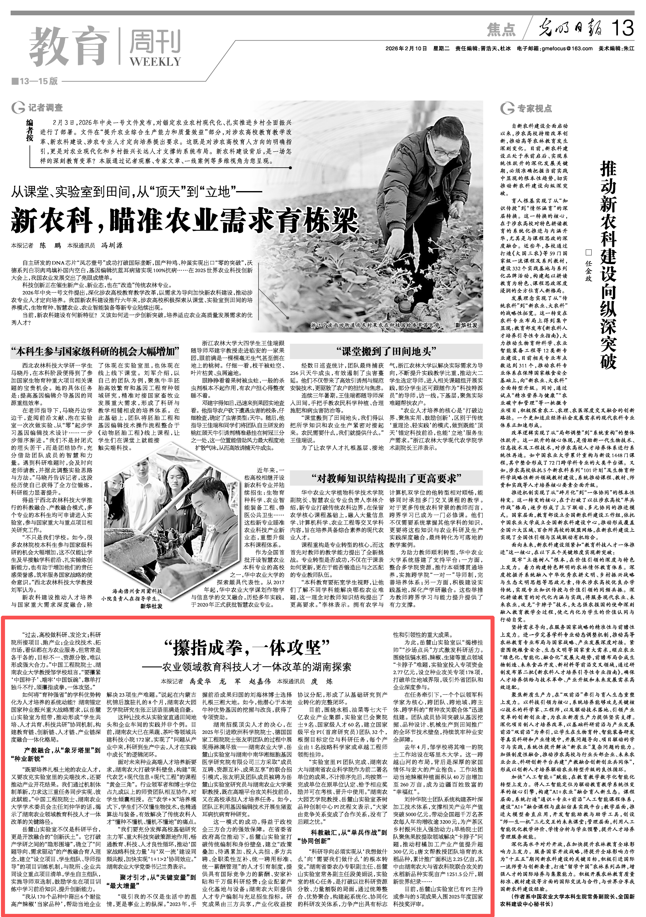 2月10日,《光明日报》以《“攥指成拳,一体攻坚”——农业领域教育科技人才一体改革的湖南探索》为题,聚焦湖南锚定国家种业振兴重大战略需求,以岳麓山实验室为纽带,推动形成“学生一体培养、人才一体引用、科技一体攻关,资源一体共享”协同机制,构建教育链、创新链、人才链、产业链深度融合一体化格局。原文如下: