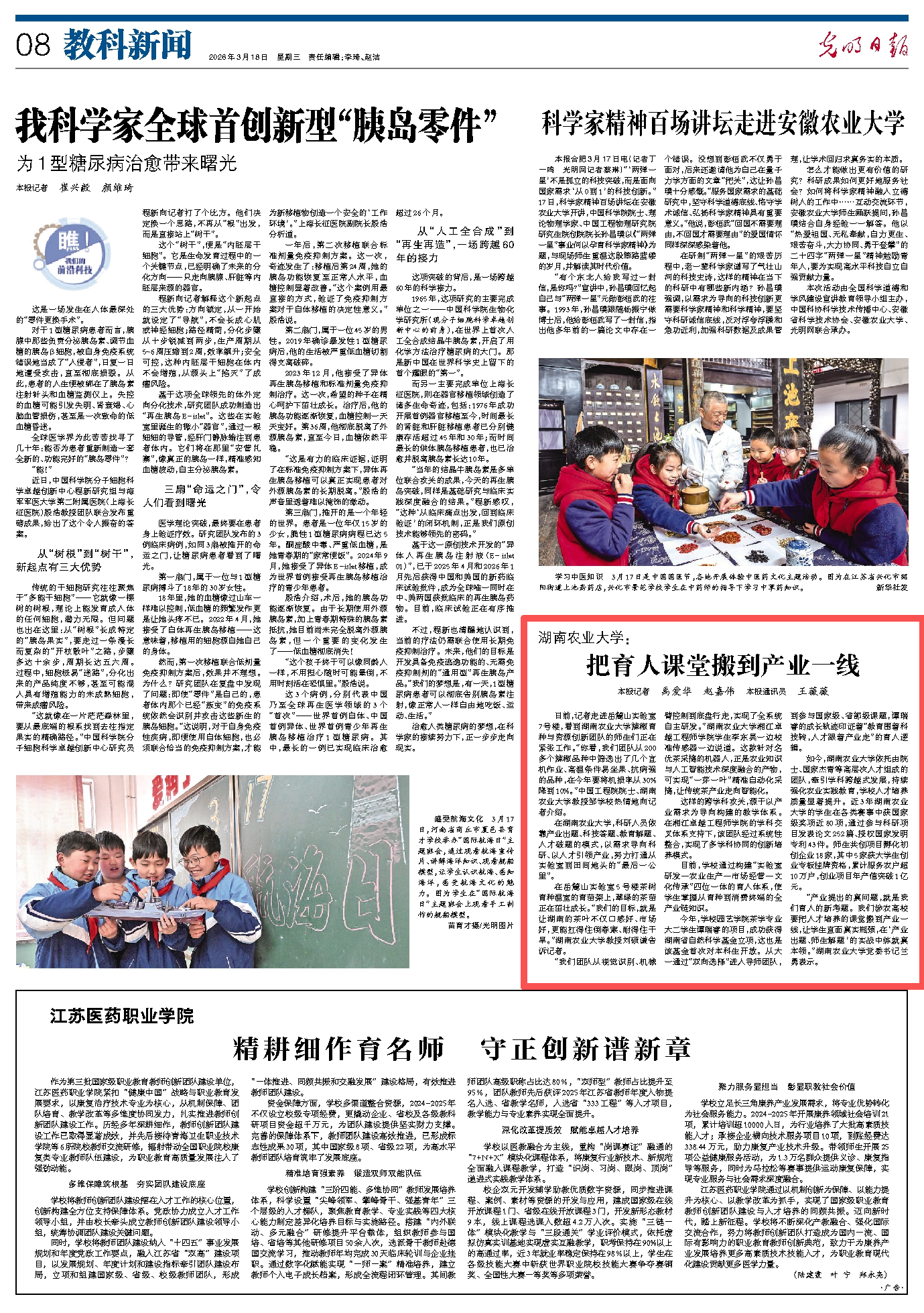 3月18日,《光明日报》以《湖南农业大学:把育人课堂搬到产业一线》为题,报道我校探索“产业出题、教科人一体答题”模式,构建“实验室研发—农业生产—市场经营—文化传承”四位一体的育人体系,以需求导向科研、以人才引领产业,努力打通从实验室到田间地头的“最后一公里”。
