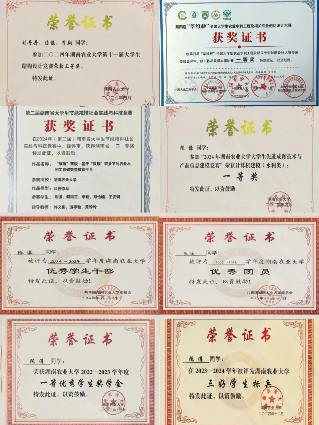 从全国赛场到省市与校园舞台,陈谦的优秀从未止步。在第二届湖南省大学生节能减排社会实践与科技竞赛中,她聚焦绿色发展主题,将农业水利知识与节能减排需求深度融合,荣获省级二等奖;回到校园赛场,她同样表现亮眼——2024年,她在湖南农业大学第十一届大学生结构设计竞赛中获校级三等奖,同年又在成图大赛中凭借精准的绘图技巧和扎实的专业素养,一举拿下校级一等奖,每一份奖项背后,都是她日夜钻研、精益求精的坚持。
