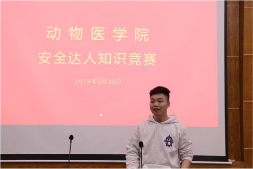 3月30日晚,动物医学院在动医楼T型教室成功举办了“安全达人”知识竞赛复赛。动物医学院学生会主席张英婕、副主席肖雪姣和肖瑶担任本次比赛评委,主持人为动物医学院女生部干事王若涵、孙梦遥,共12位参赛选手参加本次比赛。