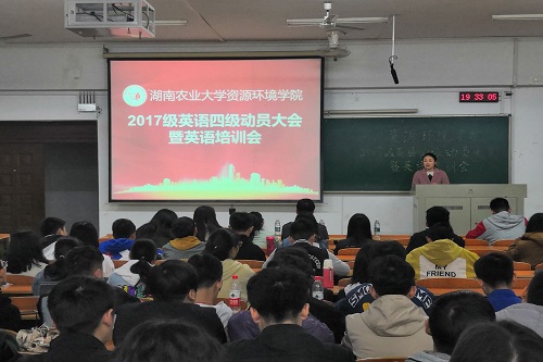 为备战2019年上半年英语四级,协调推进学院学风建设,4月10日晚,资源环境学院在九教南302召开了英语四级动员大会。资环院党委副书记刘敏老师、17级辅导员周俊海老师、学生工作办公室汤榕菂老师出席本次大会,本次大会特别邀请外国语学院龚维国老师作为主讲人。此外,17级大部分学生参加本次大会。