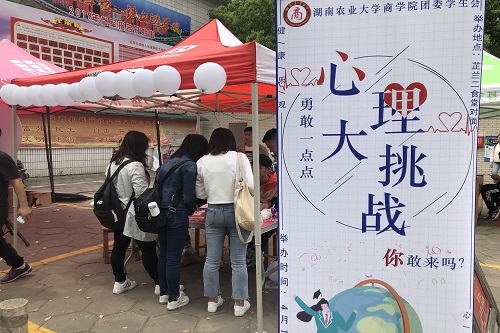 4月18日,为了迎接即将到来的“5·25”心理健康节,同时也是为了帮助同学们打破心理障碍,做勇敢的自我。商学院心健部举办了具有特色的心理挑战活动,本次活动在芷兰二食堂前进行摆点。