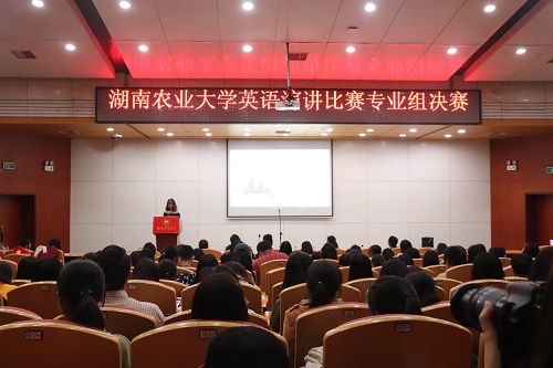 5月10日晚,为营造良好的英语学习氛围,提高大学生英语专业水平,展现大学生英语应用能力,以“My Big Story In 2049”为主题的湖南农业大学英语演讲比赛专业组决赛在学海厅拉开序幕。6名分别来自外国语学院和教育学院的英语专业同学,经过层层选拔脱颖而出,晋级决赛。外国语学院副院长汤帮耀教授、英语系副主任郭滨副教授、外国语学院英语系老师、启梦英语演讲辩论队创始人郭珊珊副教授、外国语学院外教老师Jazz和Kathy出席本次大赛并担任评委,17、18级部分英语专业学生到场观赛学习。