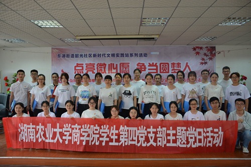 为让党员同志在志愿活动中,不断实现自我净化、自我完善、自我革新、自我提高,发扬志愿精神,鼓励更多的党员同志加入志愿服务的队伍中来。5月30日下午,湖南农业大学商学院学生第四党支部全体成员在该支部书记田燕飞老师的带领下赴韶光社区参与主题党日活动。同时,参与本次活动的人员还有商学院青年志愿者协会志愿者、社区居民、社区青少年、社区老党员。