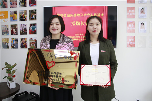 我校工学院青年志愿者协会成立于2002年,团队曾被评为“全国大学生百强暑期实践团队”、“全国百强传播力团队”等,并已成功与长沙市阳光中心、芙蓉区杉木小学达成合作关系,建立长期服务基地。团队于2019年起志愿、服务于长沙首家专注认知症照护的阿默记忆之家,在双方的共同努力下,达成共识,今日正式举行德育社会实践基地授牌仪式。