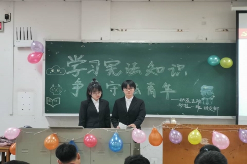 会议伊始,主持人带领大家深入学习中华人民共和国宪法的历史与发展历程。宪法作为我国根本大法,其产生、修订、确立都经历了一个漫长的时期。其中1982年所颁布的宪法是新中国成立以来最好的一部宪法。时代在发展,宪法也在与时俱进。通过多次的修改,中华人民共和国宪法的法律体系也在不断的完善与进步。随后,主持人通过播放视频这种浅显易懂的形式让同学们了解到了宪法是什么。