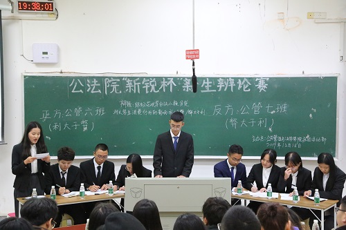 辩论是一种可以提高思辨能力,丰富课余知识,培养团队精神,锻炼思维表达的活动。为了能使同学们更好的融入大学生活,提高自信,培养创新和团队精神,12月18日晚七点半,由公法院社团活动部举办的“新锐杯”新生辩论赛于七教新t2教室成功举行。公共管理与法学学院学生会主席吴刚祥、团副刘雅芳、团副郭琳、我校校辩论队副队长张莹莹、郑伊茹以及其他队员和兄弟学院的辩论队队长及队员作为嘉宾出席了本次比赛。
