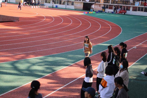 比赛中,随着裁判的红旗抬起,李颖同学弓腰,抬头,双手紧握,两眼直视前方。一声令下,她猛地迈开步,如离弦之箭般冲出,速度愈来愈快,一转眼就到达了踏板,猛地向前一跃,两腿向前伸展,像一只矫健的飞燕,在空中画出了一道弧线,落在了松软软的沙子里。