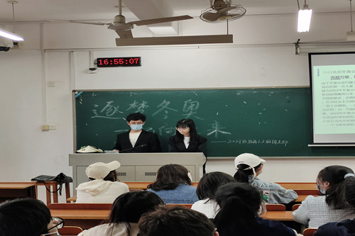 “冬奥的底色,是美丽中国。”会议伊始,主持人带领同学们回顾冬奥会走向绿色创新自信的历史。同学们深刻认识到祖国克服万难,成功贯彻可持续发展理念,以"有朋自远方来,不亦乐乎"的大国情怀,抓住了展现大国形象的良机。